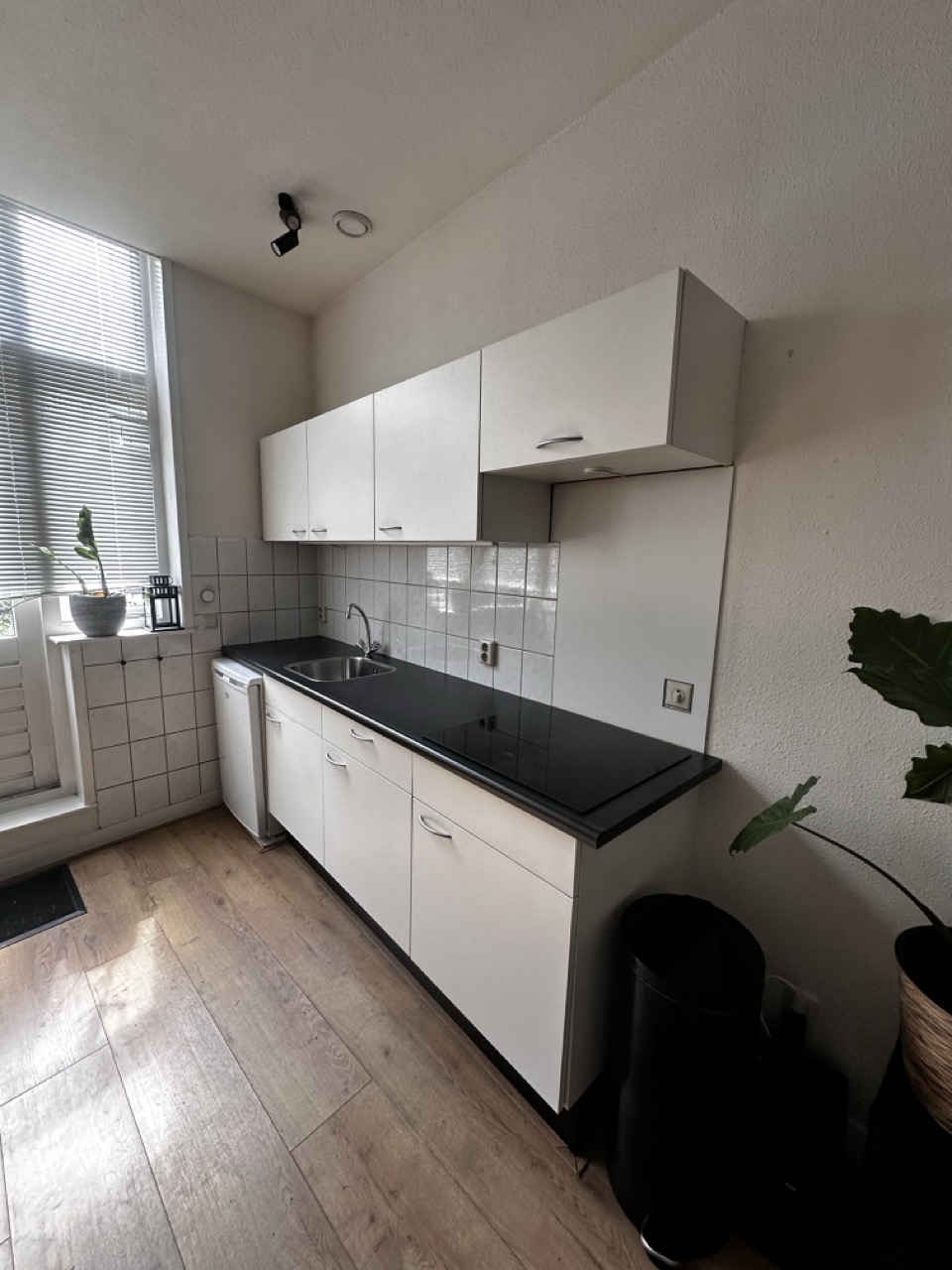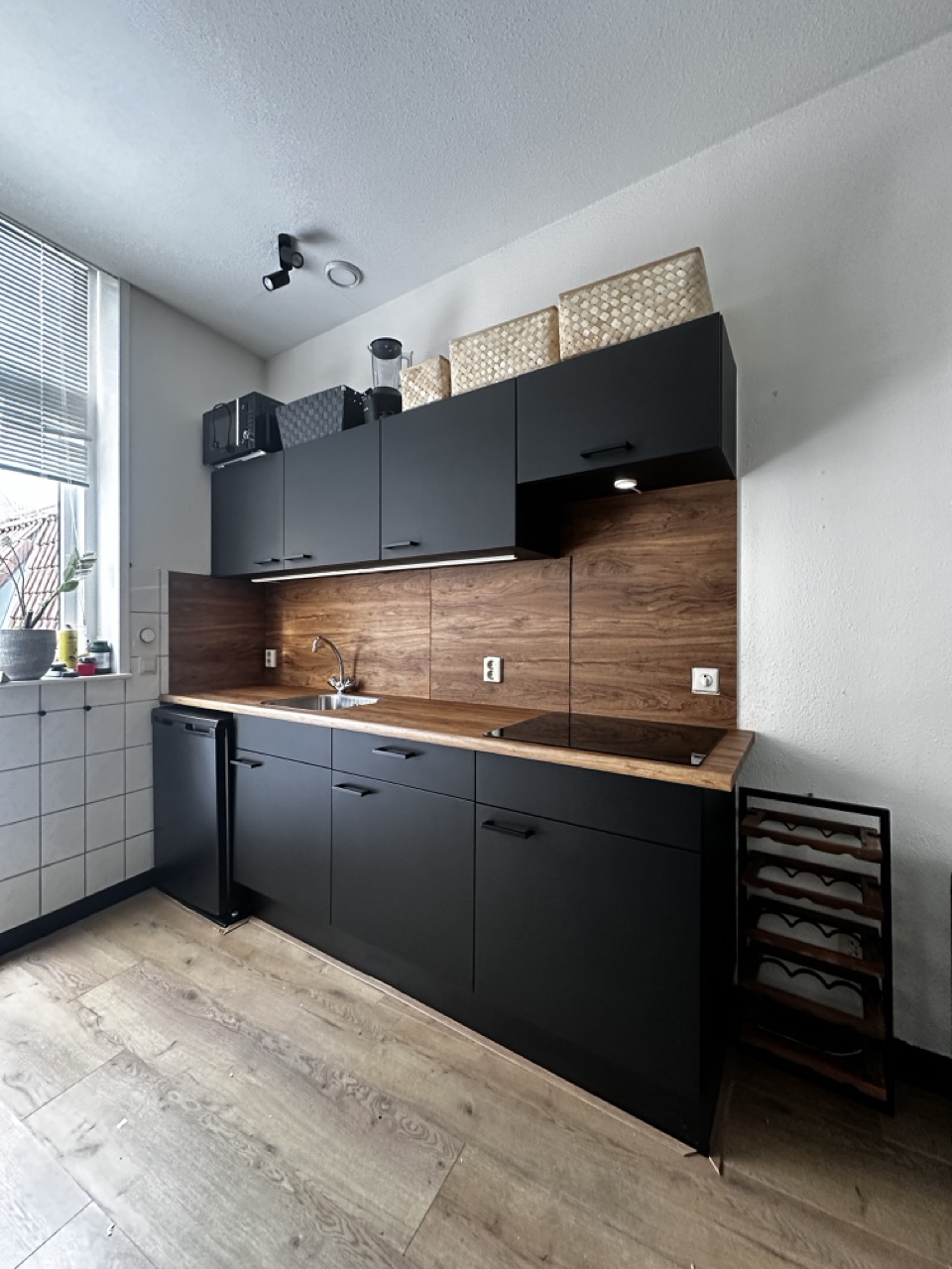 In hartje Leiden hebben we in deze keuken het aanrechtblad en de achterwand voorzien van een prachtige houtlook. Het warme hout combineert perfect met de zwarte kastjes, waardoor de keuken een gezellige en moderne uitstraling heeft gekregen. Een sfeervolle plek om te koken.